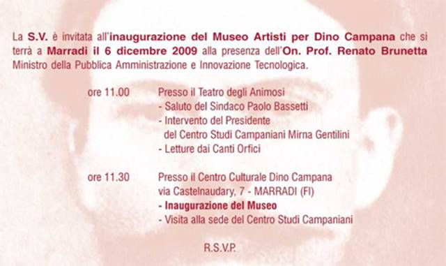 Invito inaugurazione Museo Artisti per Dino Campana-6 dicembre 2009