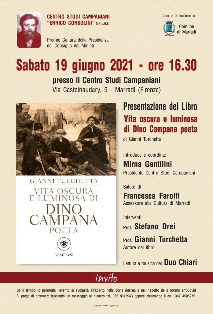 Domenicane presso il Centro Studi Campaniani, Via Castelnaudary, 5 Marradi (FI), si terrà la presentazione di Vita oscura e luminosa di Dino Campana, poeta di Gianni Turchetta, pubblicata nel 2020 per Bompiani (ma dato il suo successo, già alla sua seconda ristampa). All’evento introdotto e coordinato da Mirna Gentilini, presidente del Centro Studi Campaniani, parteciperanno oltre all’autore il Professor Stefano Drei che presenterà e commenterà il libro, Francesca Farolfi, assessore alla Cultura di Marradi, che porterà il saluto dell’Amministrazione e infine il Duo Chiari (Mariasole e Leonardo) che interverrà durante l’incontro con letture musicali inedite di alcuni passi dell’opera campaniana. Il libro di Turchetta, ultima biografia completa e prestigiosa sul poeta, ci conduce gradualmente, attraverso le fonti, i documenti, le fotografie, le testimonianze e i versi alla scoperta dell’ombra e della luce della vita di Campana, rivelandoci insieme le movenze e i moventi della sua poesia. Tra la pluralità delle voci e delle fonti raccolte dall’autore, emerge la parabola unitaria della vita di Campana: quella vita straordinaria, benedetta e maledetta dalla poesia, di viaggi fisici e spirituali, dall’Appennino alla Pampa, dal manovale al pianista nei bordelli; fra madonne, prostitute e sfingi, chimere; e poi sbornie, risse con i letterati del tempo e intanto e sempre amori lontani, tragici, come quello con Sibilla Aleramo, fino al carcere, al manicomio, alla follia. Una vita misteriosa che fu ostile a Campana anche dopo la sua morte, tanto che nel corso del Novecento si alimentò una sorta di mitologia campaniana. Per la prima volta, invece, le pagine appassionate e appassionanti di Turchetta ci restituiscono la vita del poeta nella sua integra purezza. E il Campana autentico che ne emerge non è più poeta-indovino, invasato o folle, bensì, finalmente, uomo, scrittore, quasi artigiano, che medita, riscrive e lavora lucidamente sui suoi versi; finalmente genio che, pur nella sua vita turbolenta e ondivaga,ci consegna un capolavoro immortale: i Canti Orfici. Vi aspettiamo nella Corte delle Domenicane e per il rispetto delle norme antiCovid è auspicabile la prenotazione.( tel. 055 8045943 cell. 3474505279).